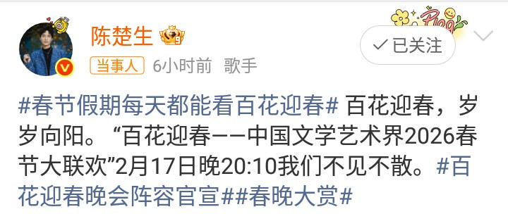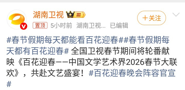 就这么,优秀歌手在2026年的春节时刻,取得了更好的献艺契机!2026年马年春晚行将驾临!百花迎春晚会,也一样让东说念主期待!一时刻,网友们纷繁关心“春节假期每天齐能看百花迎春”话题音尘。