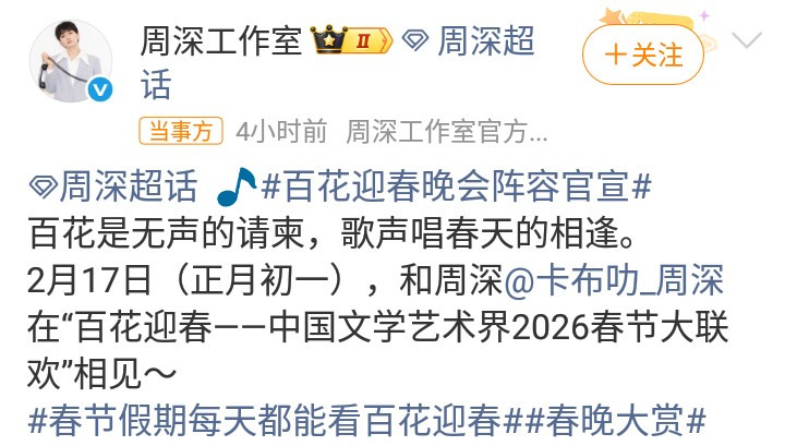 一张精良的宣传海报,见证了歌手周深最好意思好的一面。周深职责室在酬酢平台发文:百花是无声的请帖,歌声是春天的相逢。 因此,在2026年春节时刻,约略看到歌手周深的献艺行为,亦然一个令东说念主期待的场景。
