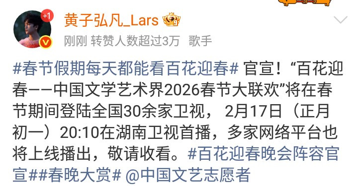 值得一提的是,黄子弘凡的官宣海报,可谓是棒极了! 黄子弘凡在酬酢平台发文臣宣!信息量好大!黄子弘凡在发文中写说念:百花迎春,中国文体艺术界2026春节大联欢,将在春节时刻登陆寰球30余家卫视。看来,百花迎春献艺行为,知名度相等高,名气大,不雅众的关心度也很高。