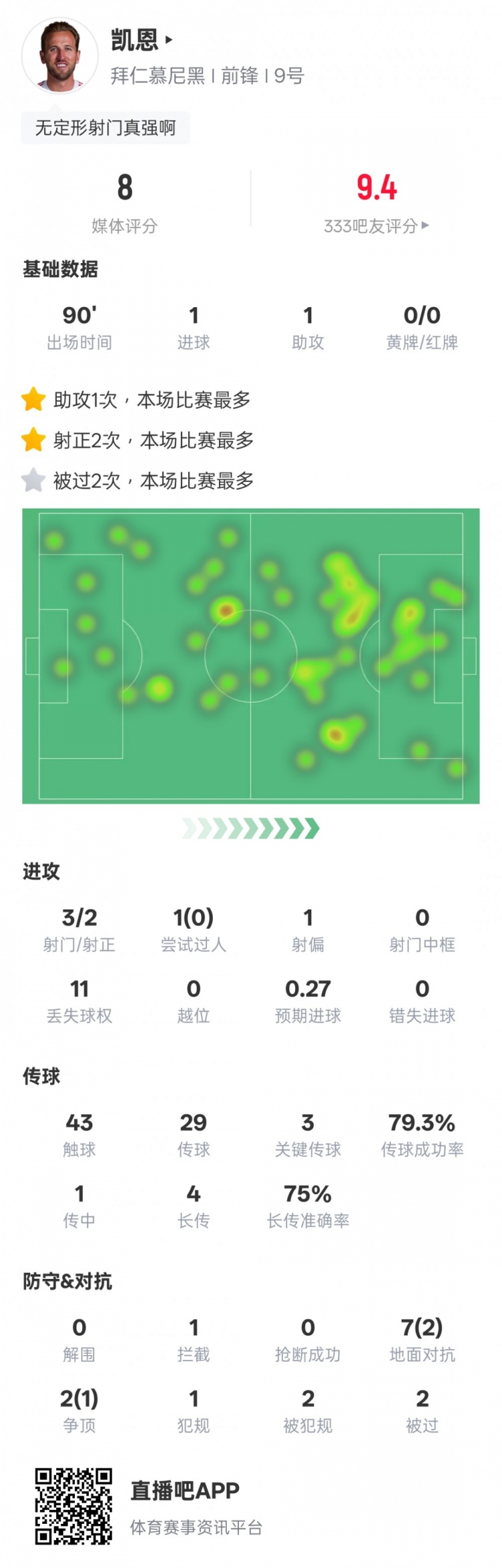 4月16日讯 欧冠1/4决赛次回合,拜仁主场4-3皇马,总比分6-4晋级四强。凯恩本场首发出战,开云app下载传射立功,另外他还有3次要津传球,评分8.0。