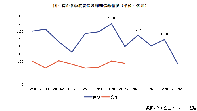 由于比年来房企债券刊行限制下滑显着,2026年房企合座的债务到期限制也显着下落,全年到期约4038亿元,其中一季度到期约1298亿,三季度到期1180亿,为年内的高点。