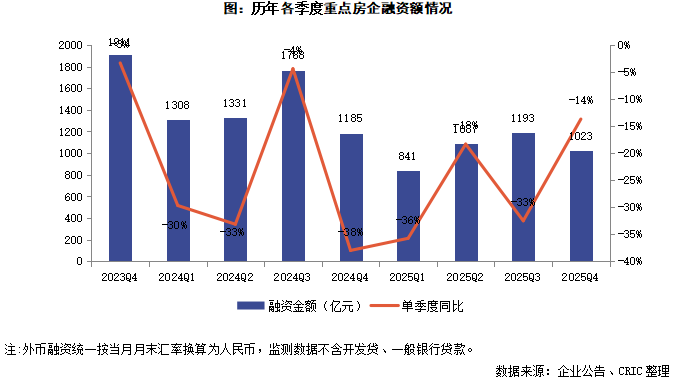 2025年房企融资仍然呈现裁汰态势,全年融资限制达4143亿,同比下落26%。其中第四季度融资1023亿,环比下落14%,同比下落14%,仍然处于历史低位。可见,自2024年房企融资复旧计策天然边缘改善,各地更是推行融资伙同机制“白名单”,但非银融资限制仍未改造下滑趋势,大批民营房企,尤其是脱险房企,融资难的问题依然隆起。