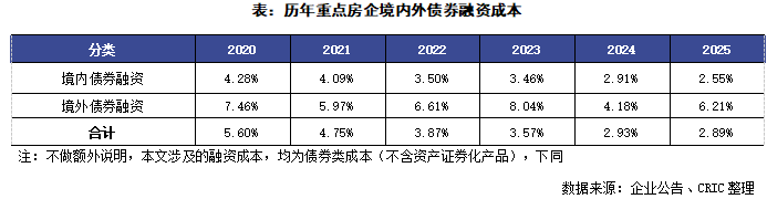 2025年重心房企境内债券融资本钱进一步下落至2.55%,开云较2024年全年连续下落了0.36个百分点。境内债券融资本钱束缚下落,一方面是由于自2024年货币环境启动宽松,LPR执续下调;另一方面,发借主体大大批为国企央企及优质民企,这类企业融资上风较为显着,如发债较多的华润置地、保利发展、招商蛇口等等。2025年合座新增债券类融资本钱为2.89%。
