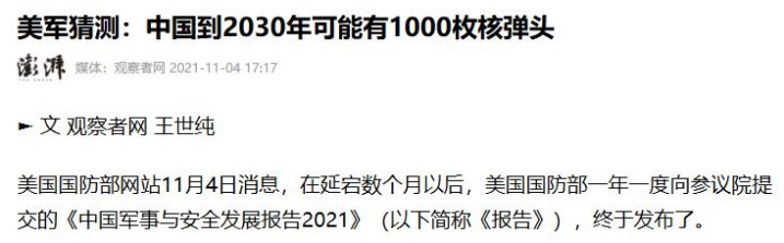 滂湃新闻 好意思军推断:中国到2030年可能有1000枚核弹头