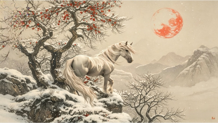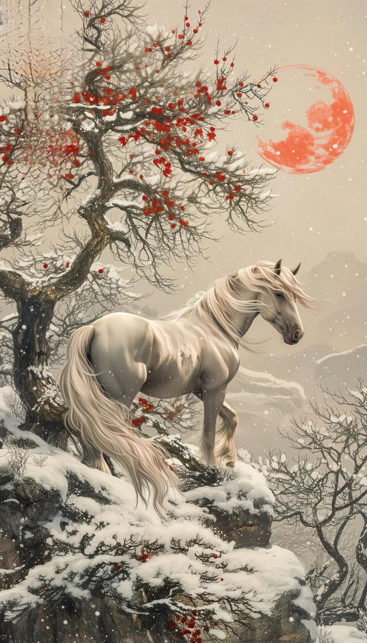 马之姿,雄浑磅礴,气逾霄汉。鬃毛高涨如烈炬,马蹄踏雪若惊雷,抬头则啸震漫空,奋蹄则万里追风。或驰于迷茫郊外,与落日余光相映;或行于古谈西风,伴海角倦客同业。它是摆脱的化身,是力量的图腾,并立风骨,写尽世界轩敞。