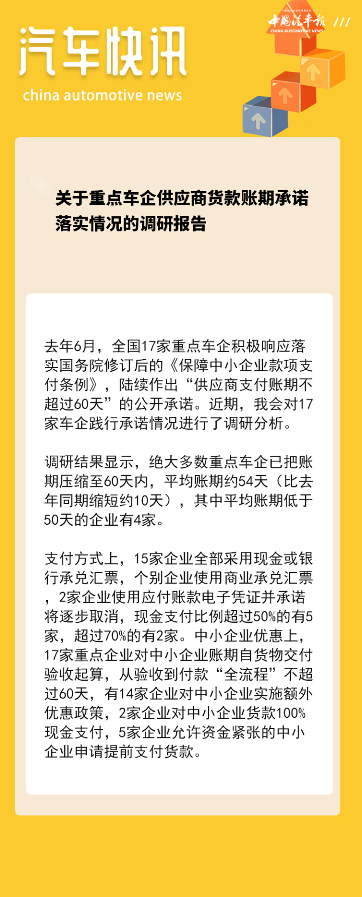 客岁6月,世界17家重心车企积极响应落实国务院立异后的《保险中小企业款项支付条例》,持续作出“供应商支付账期不跳动60天”的公开情愿。近期,我会对17家车企践行情愿情况进行了调研分析。