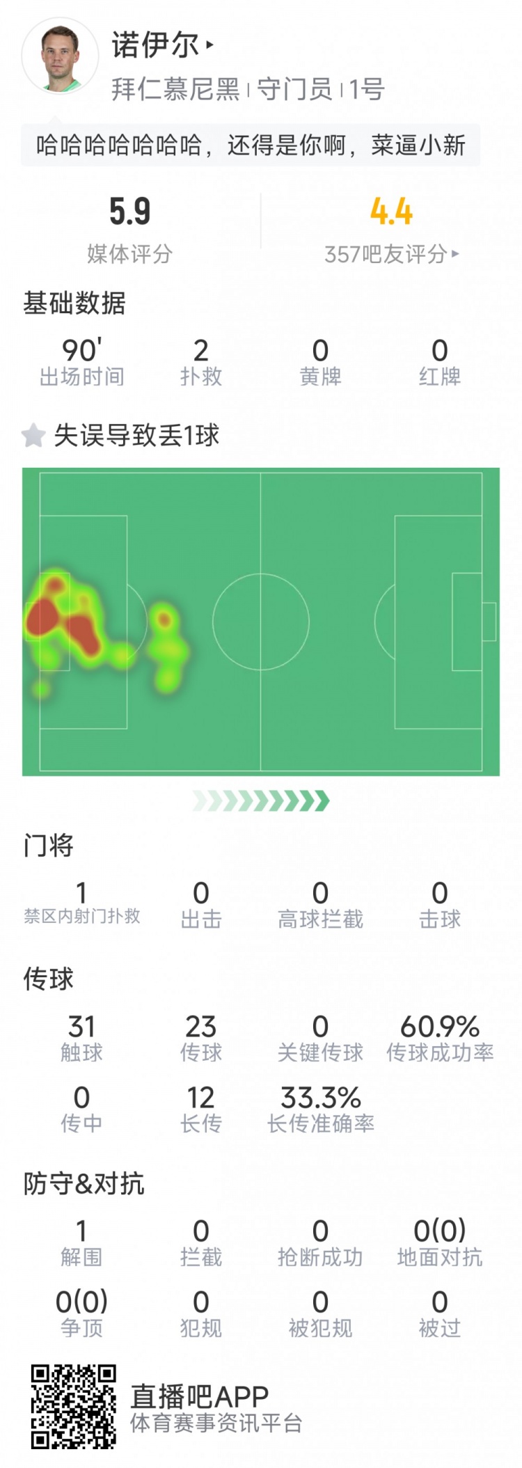 本场比赛诺伊尔在开场不久站立导致丢球,开云体育官方网站不外之后也有2次关节扑救,31次触球开云app,传球告捷率61%,评分5.9分。